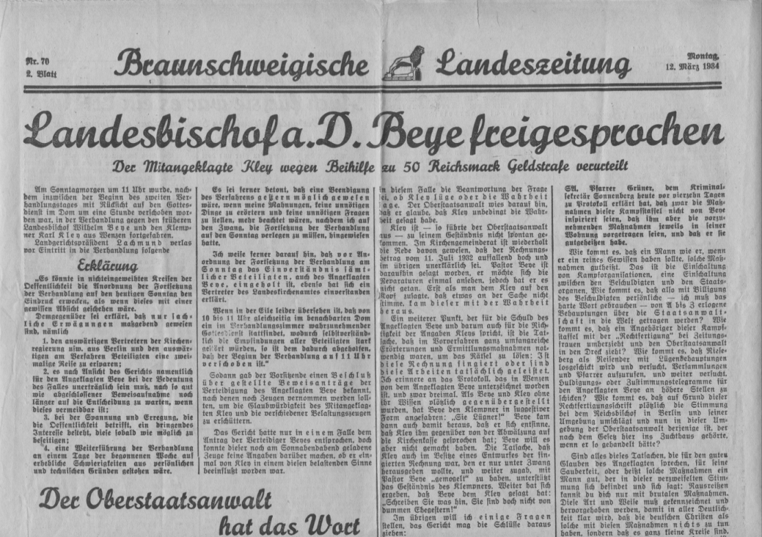 Schlagzeile der Braunschweigischen Landeszeitung vom 12.03.1934. Landesischof a.D. Beye freigesprochen.