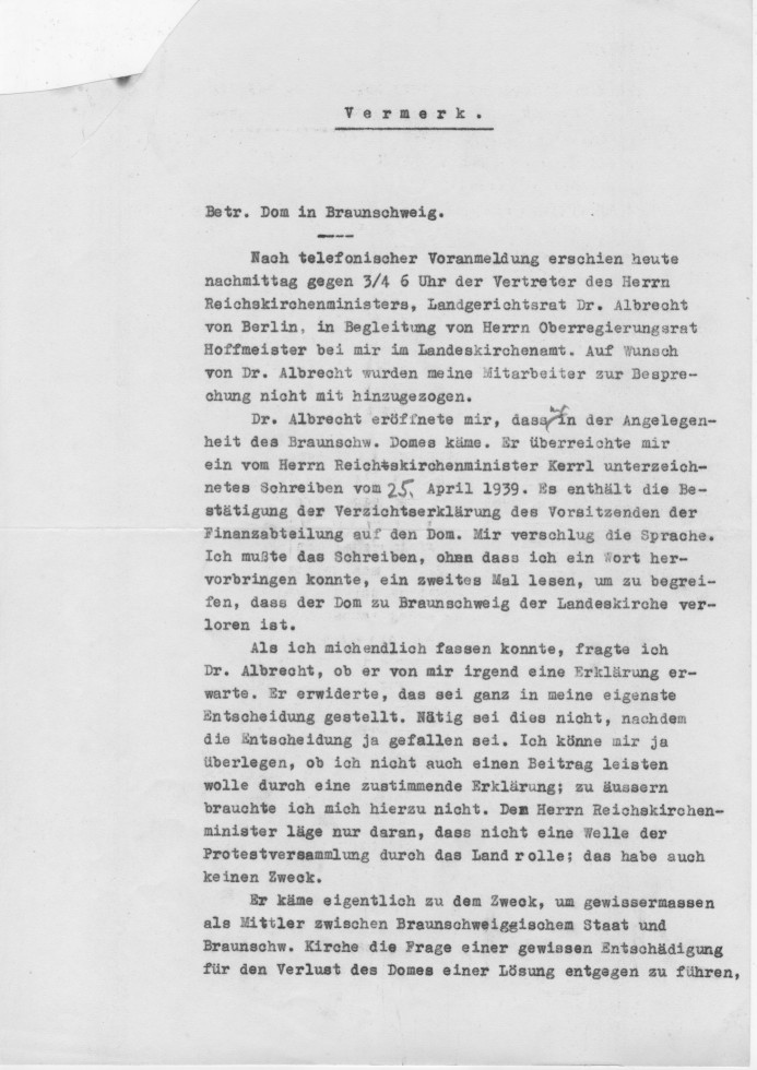 Persönlicher Vermerk von Jürgens über den Besuch von Hoffmeister und Albrecht am 2.05.1939 betreffend den Braunschweiger Dom. Seite 1 von 4.