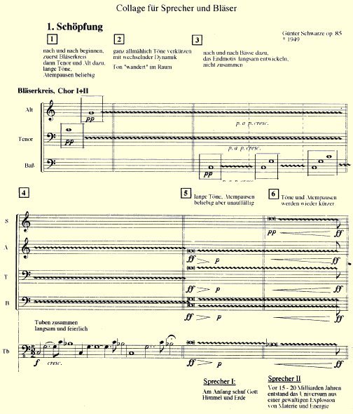 Das Notenbild einer Bläserkollage, die am 24. Mai um 19.30 in der Melleniumhalle in Braunschweig Madameweg 77 mit anderen Werken Neuer Meister zu hören war. 170 Bläserinnen und Bläser musizierten unter der Leitung von Siegfried Markowis.